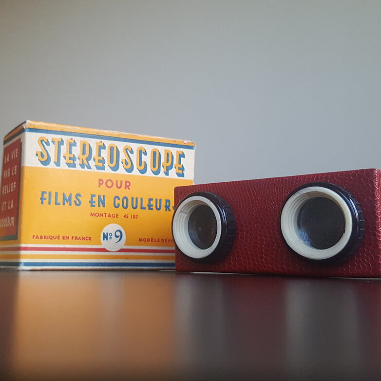 The beautiful red snakeskin-textured Bruguière No. 9 is part of George Bruguière's line of stereo viewers. The body is made of cardboard and the back piece slides in and out to focus the view. This one came into our collection with a box of Stereocolor slides of Château de Malmaison, which was once Josephine & Napoleon Bonaparte's private estate.