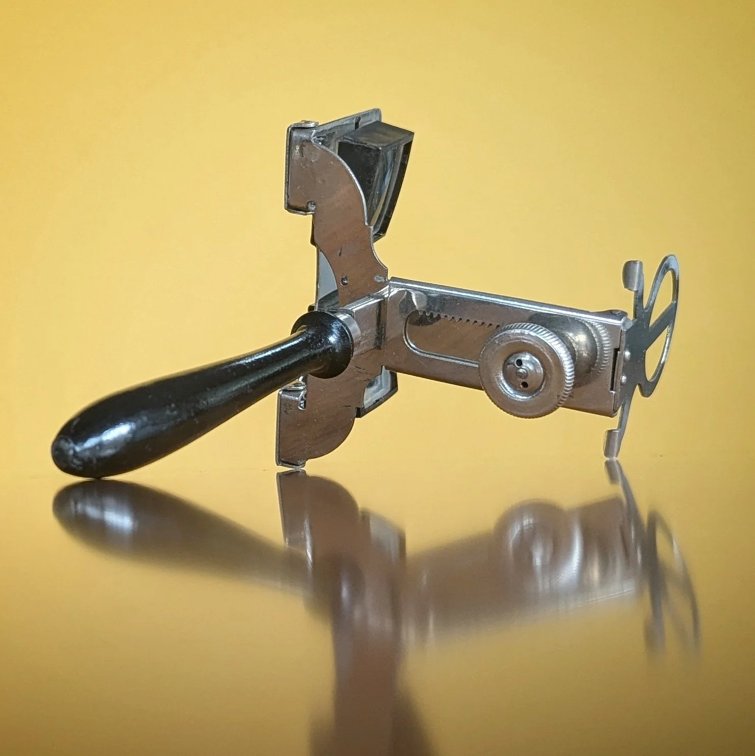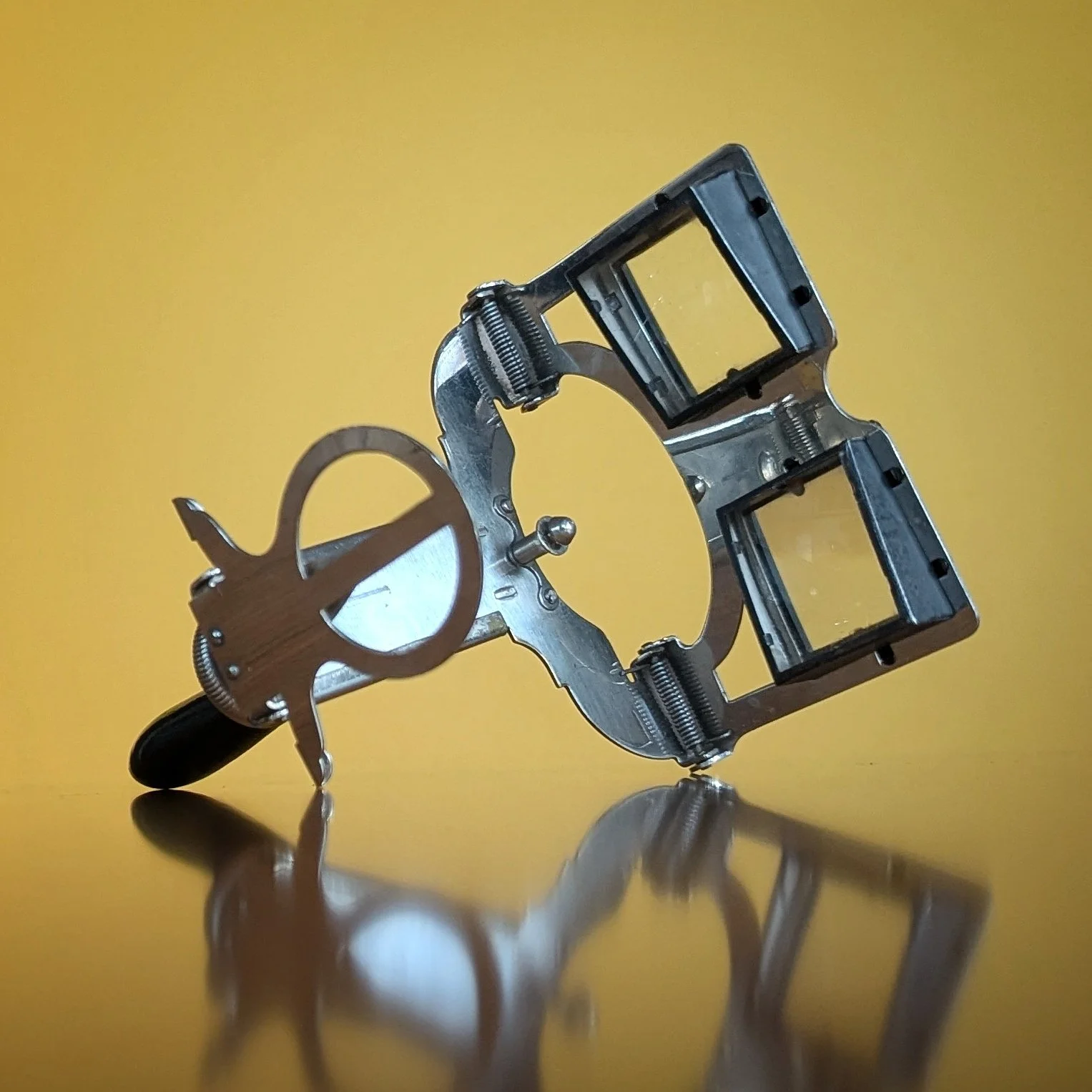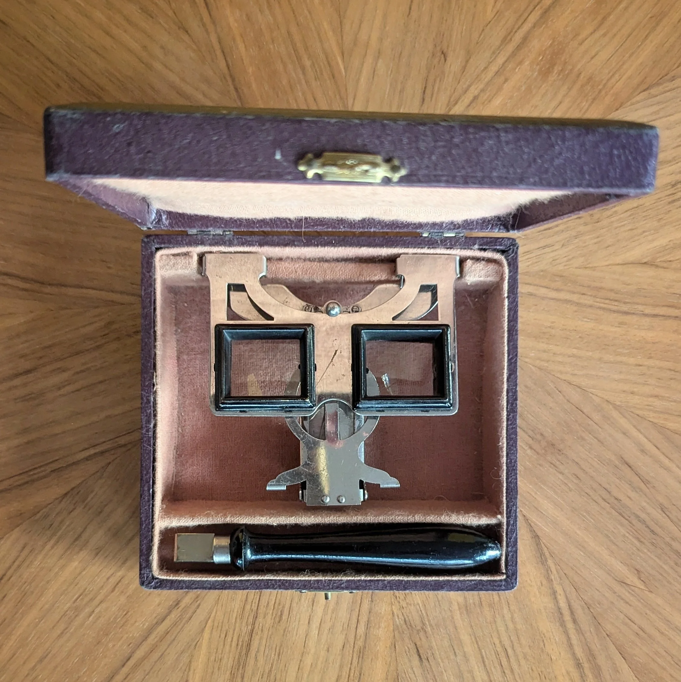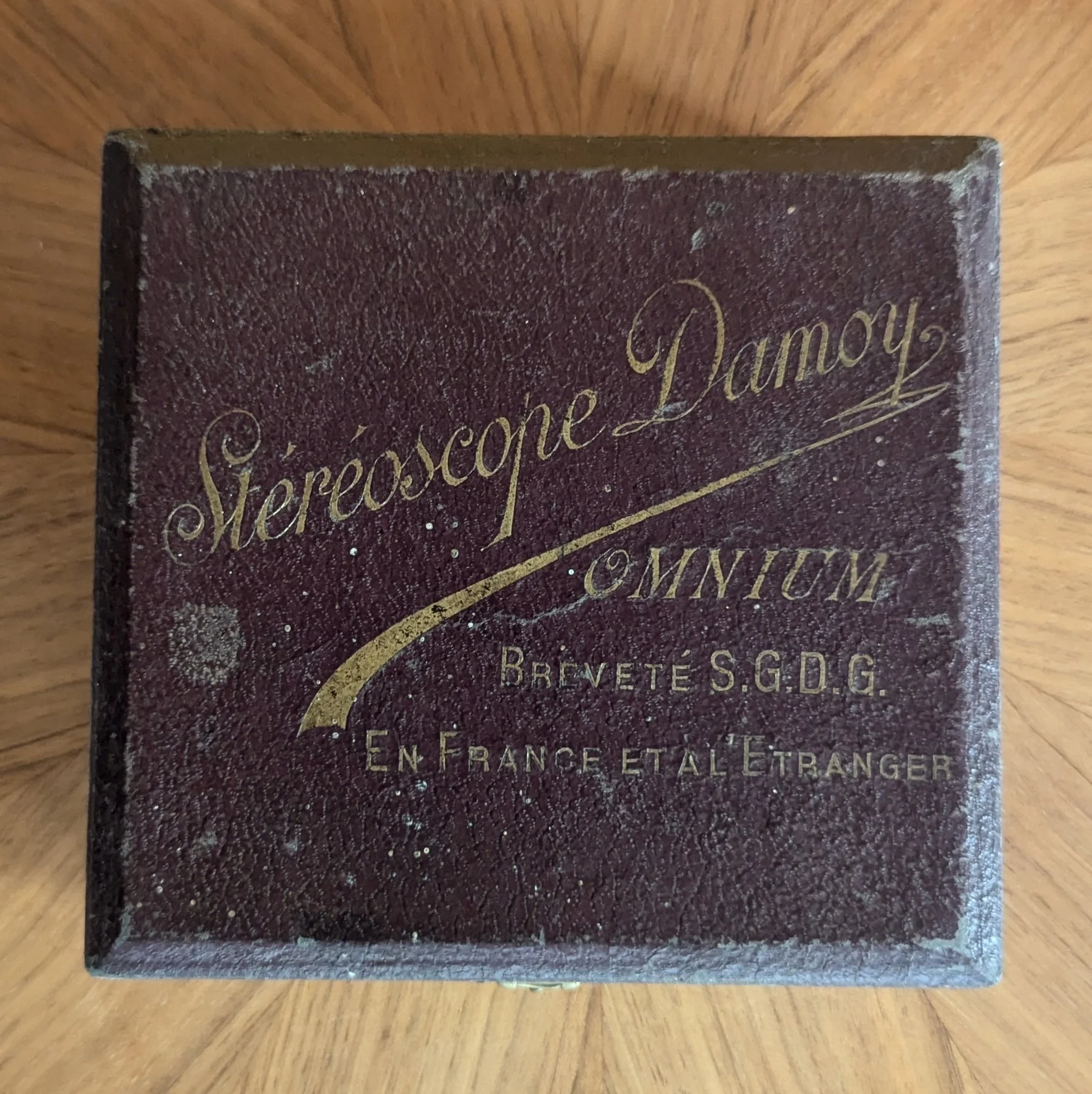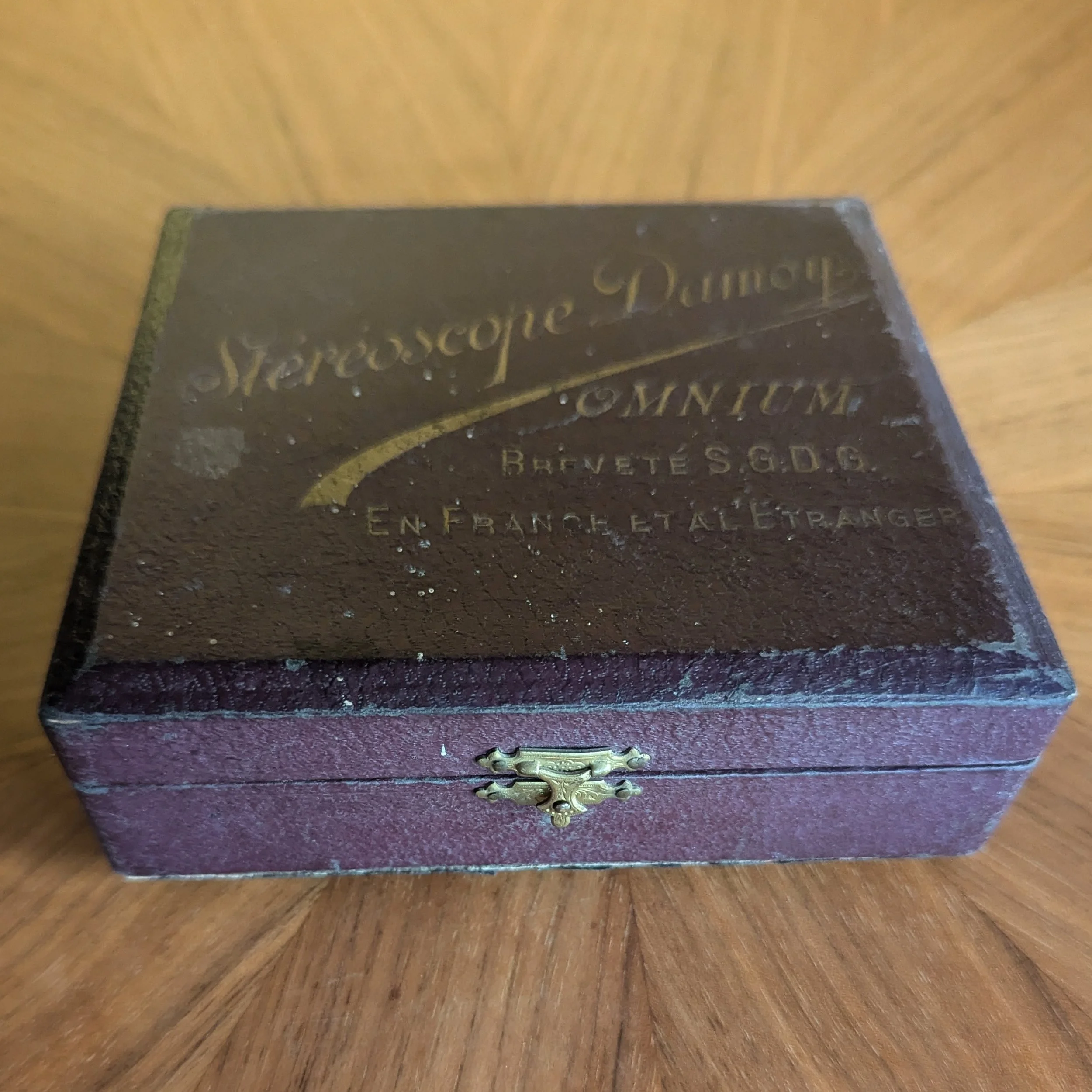 In the early 1900s, Julien Damoy had stereoviews, wooden stereoscopes, and metal stereoscope cases bearing his name. However, Damoy wasn’t a stereoview publisher nor a designer or manufacturer of stereoscopes. He was a successful grocer who used stereoviews as a way of attracting customers. The Omnium stereoscope (L’Omnium) was patented in 1904 by Lucien Bize and was designed for easy disassembly and folding, allowing it to fit into a small case. It can be found with round or square eyepieces.