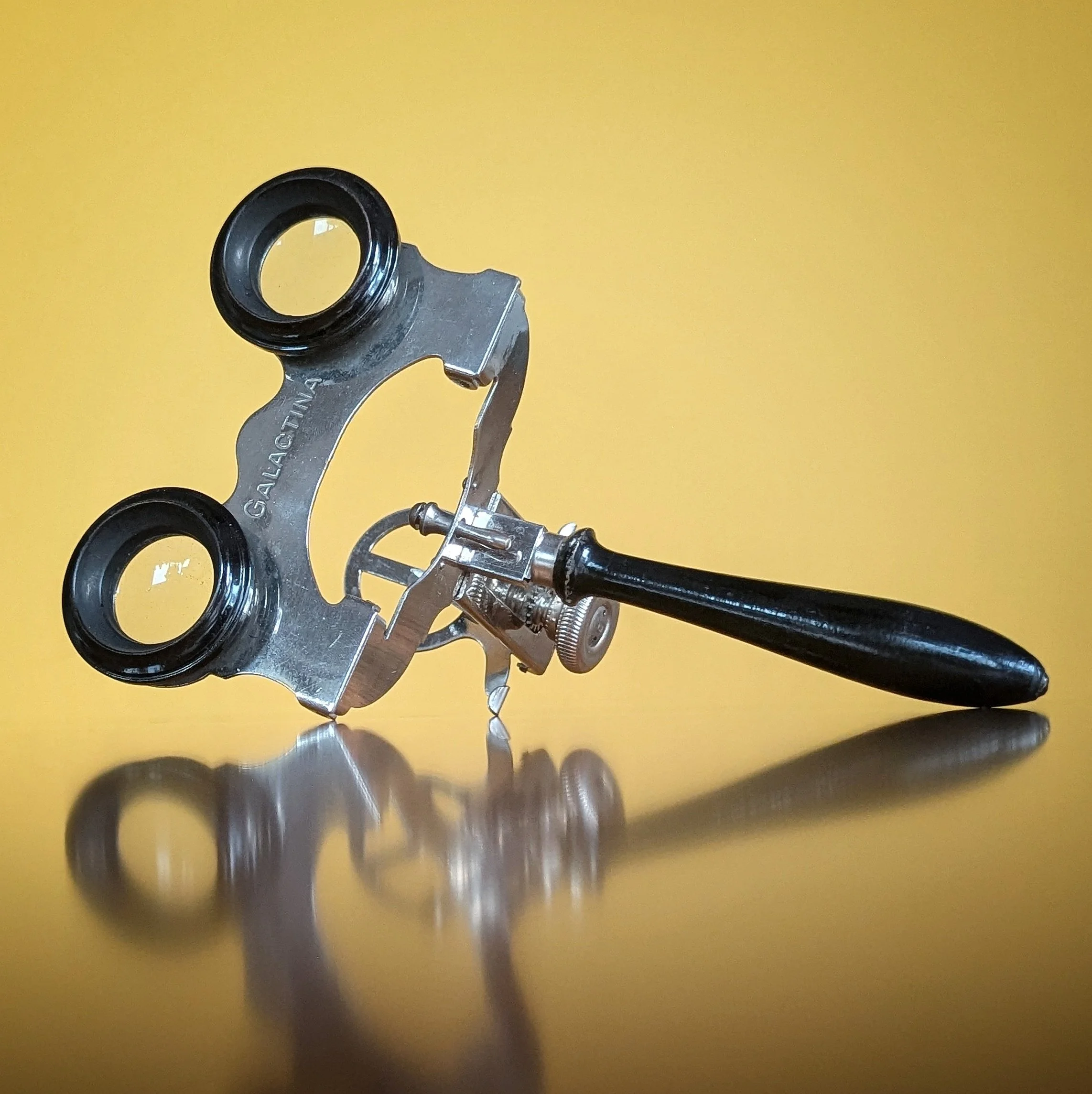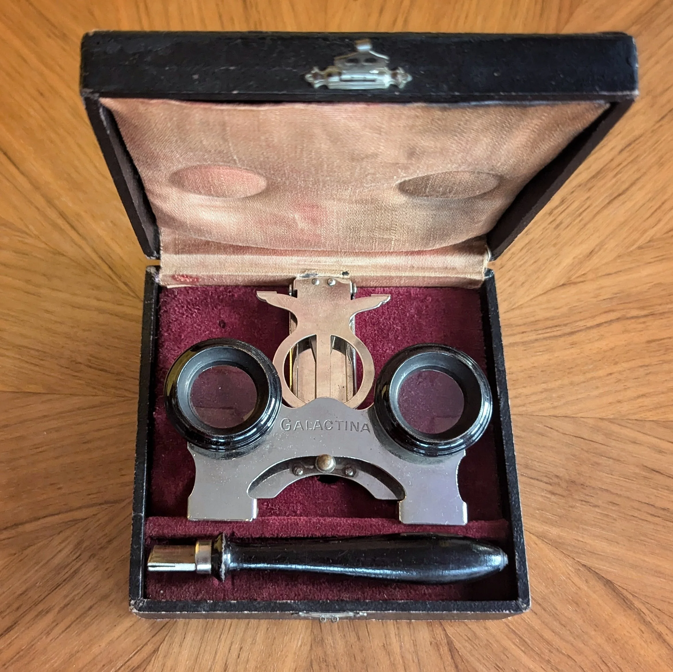 This Omnium stereoscope and case is branded to advertise Galactina, a Swiss milk flour product for children. There were at least 61 sequentially numbered scenic stereoviews in the Galactina set that could be collected, all with Galactina advertising printed on the back. The cool thing is that in the middle of this scenic set were 6 stereoviews with children acting out a commercial for Galactina.