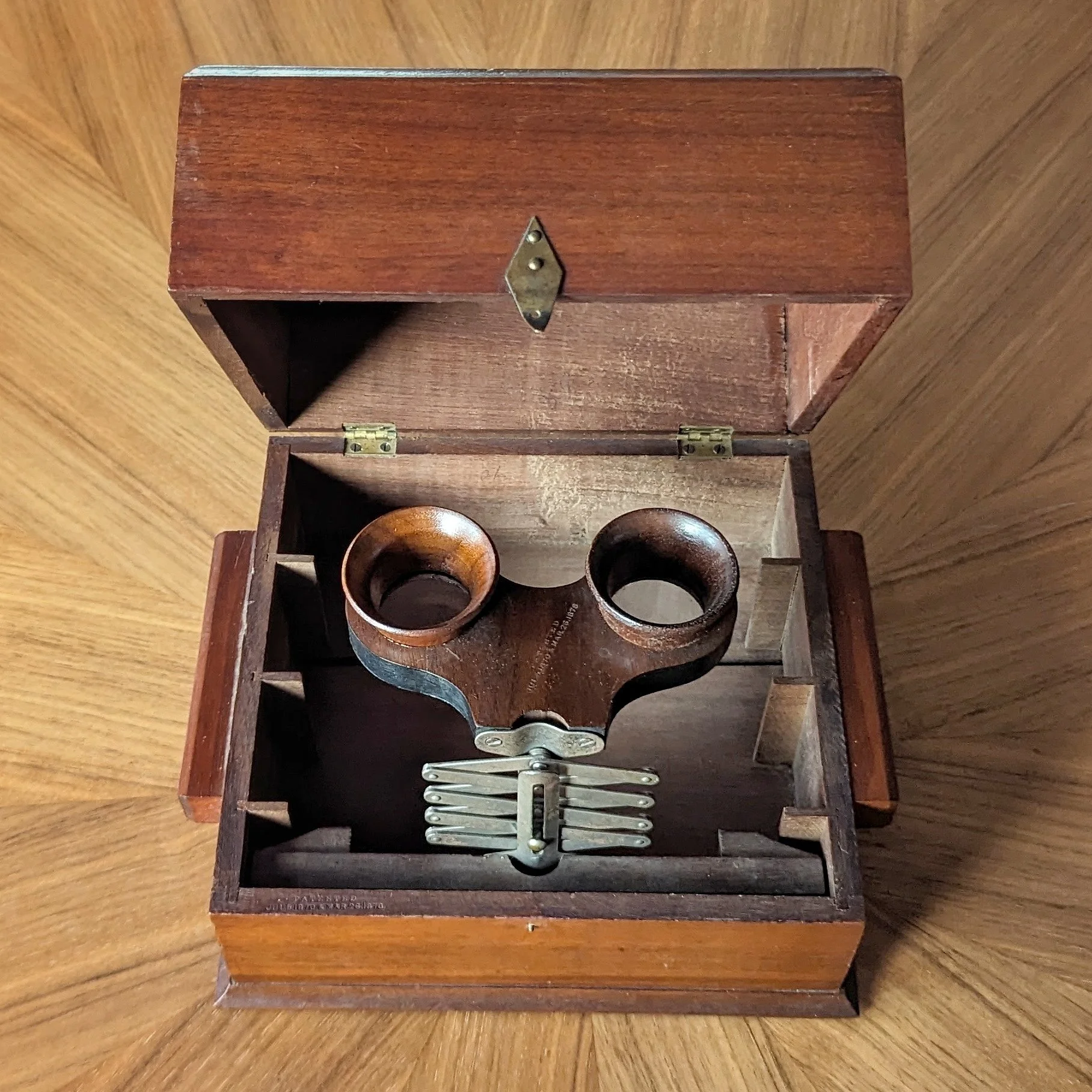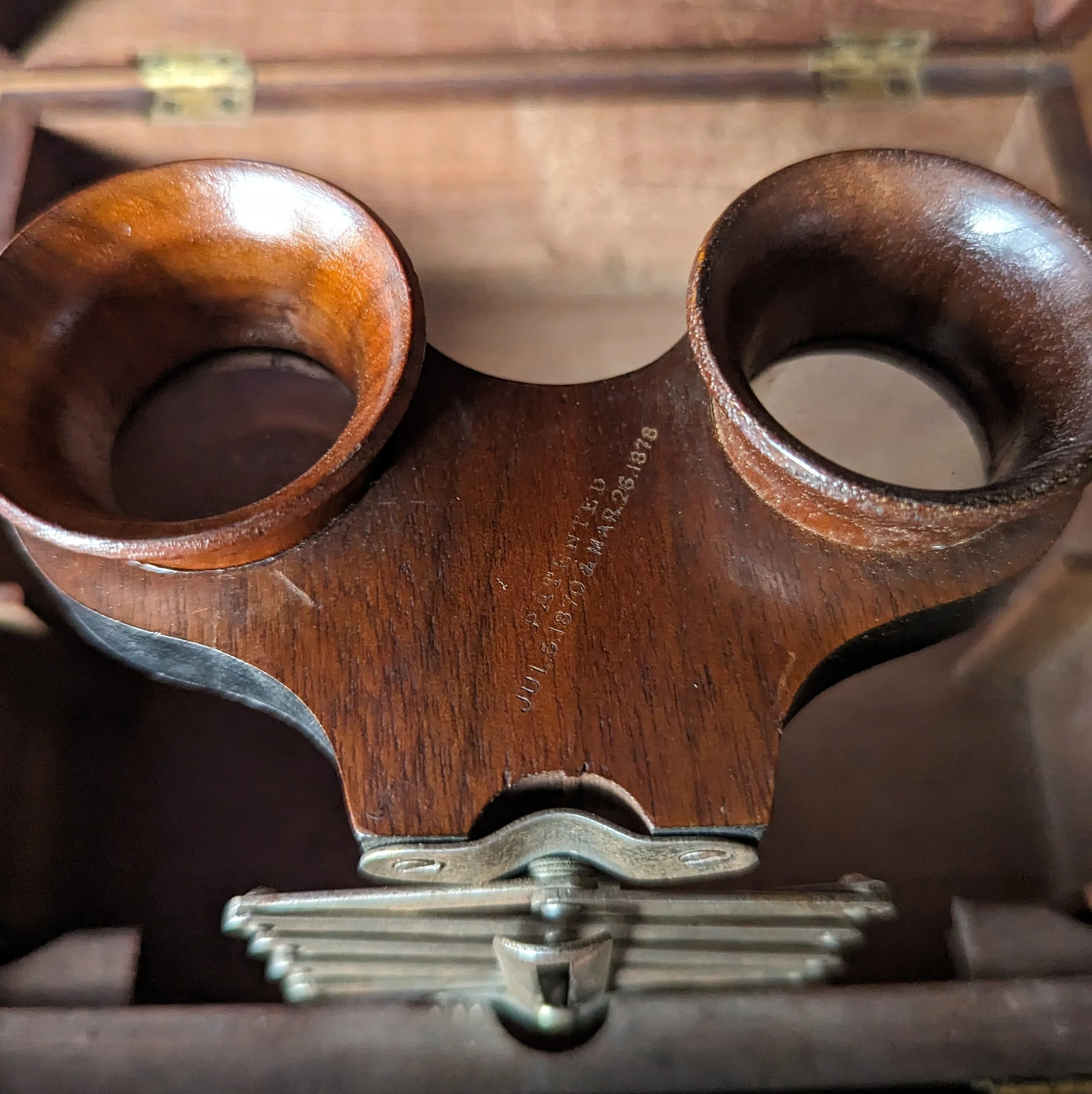 The only markings on this stereoscope reference the patent dates for its two unique features:
