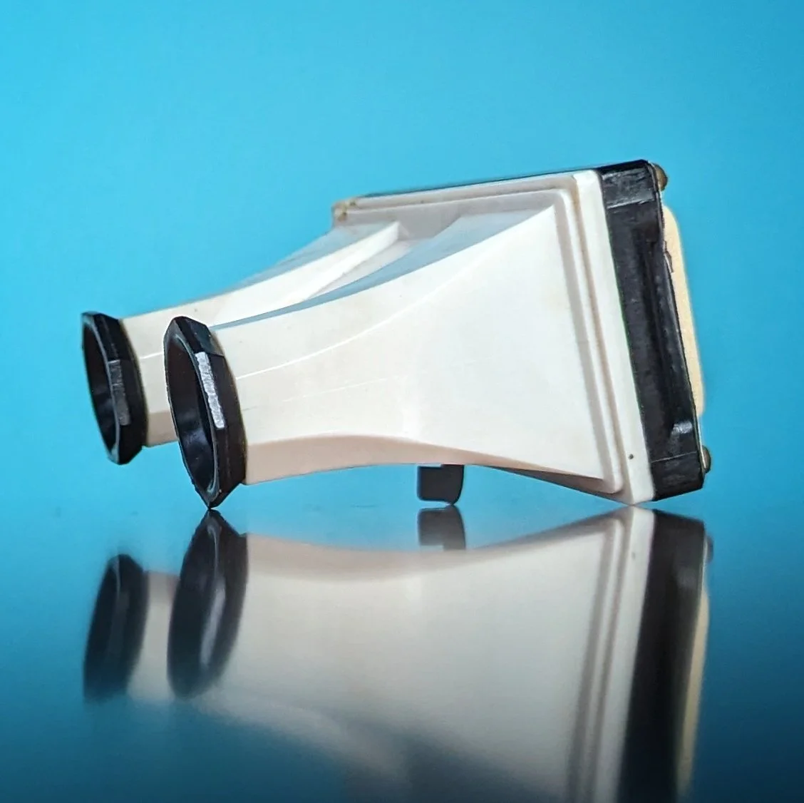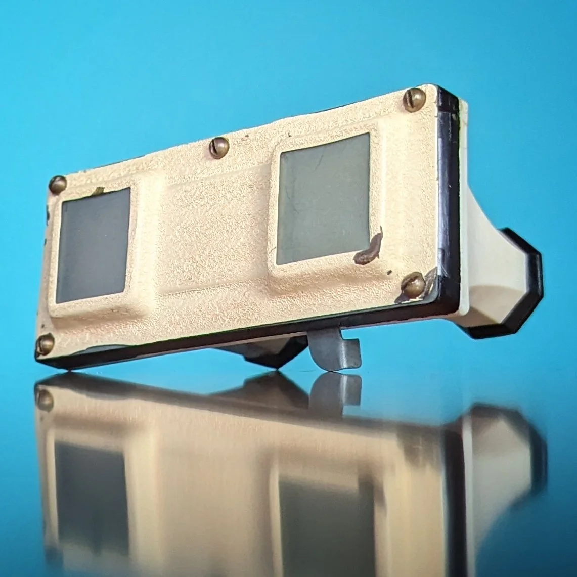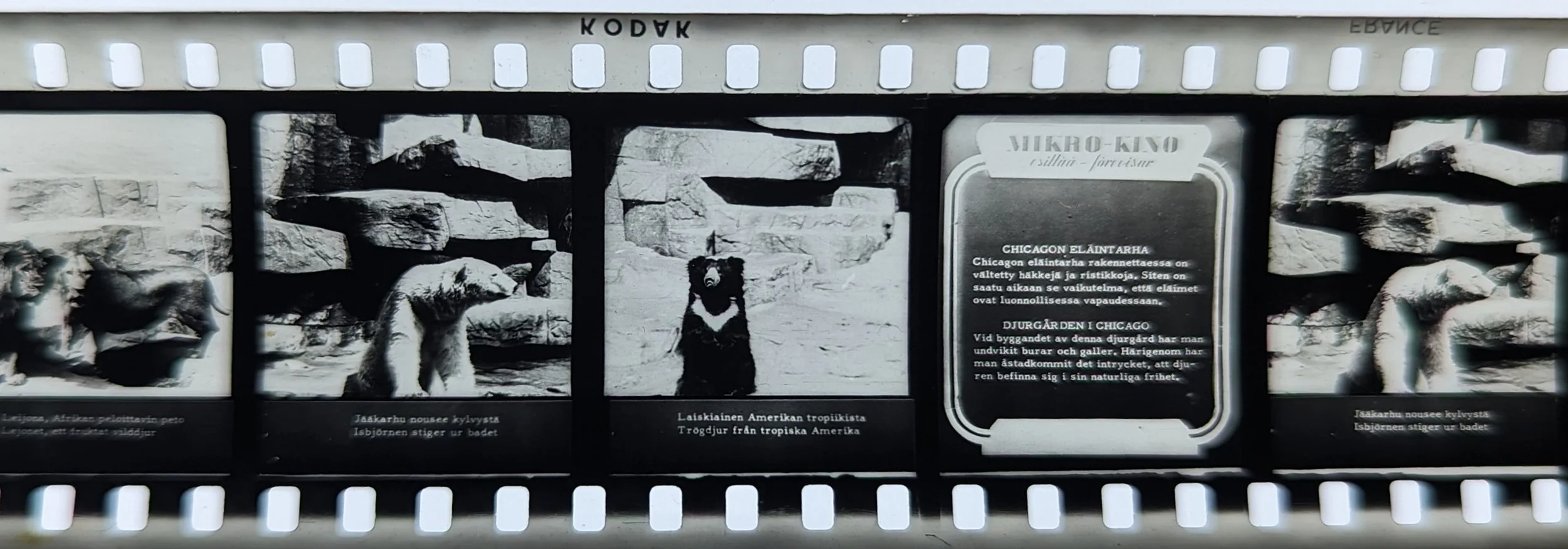 This scarce filmstrip viewer has the same design as the original 1930s Tru-Vue viewer but was made a couple of decades later by a Finnish company. The viewer is completely unmarked but the text on the film boxes and filmstrips is in Finnish and Swedish. With the Mikro-Kino, our experience is that while both the viewer and films are extremely hard to find, the viewer is the scarcer of the two — at least we find that to be true in the United States.