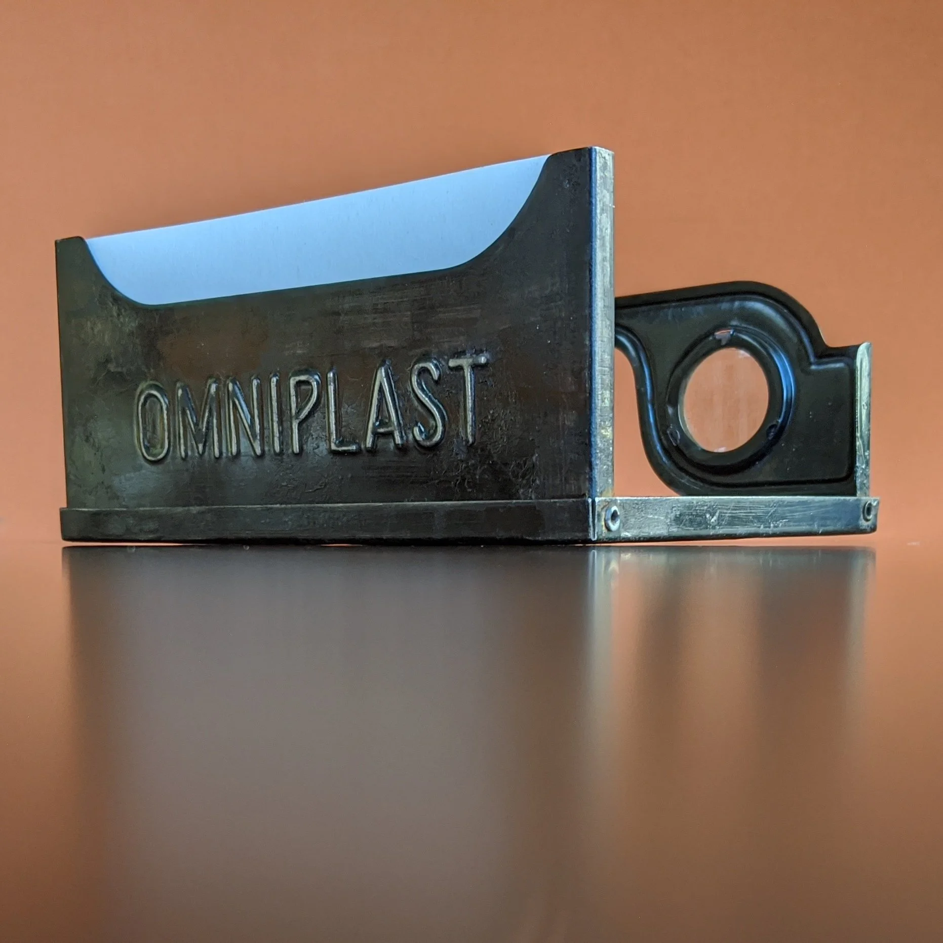 The Omniplast company made several different black metal stereo viewers. Two were for 6 x 13 cm stereoviews: one with focusing capability and one without (pictured below). They also created a viewer for 9 x 12 cm stereoviews which looked like the Camerascope viewer. They also made cardboard stereo viewers.