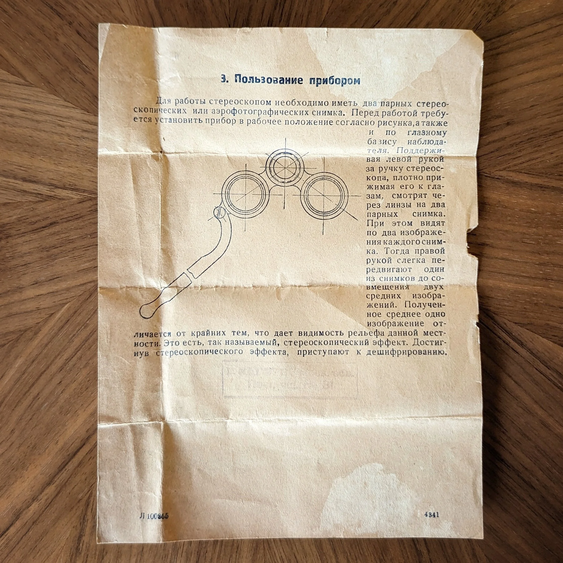 This lorgnette stereoscope was used by the Red Army NKVD for decoding 18x18-format aerial photographs. The sheet inside the viewer’s padded case contains diagrams and instructions for use:
