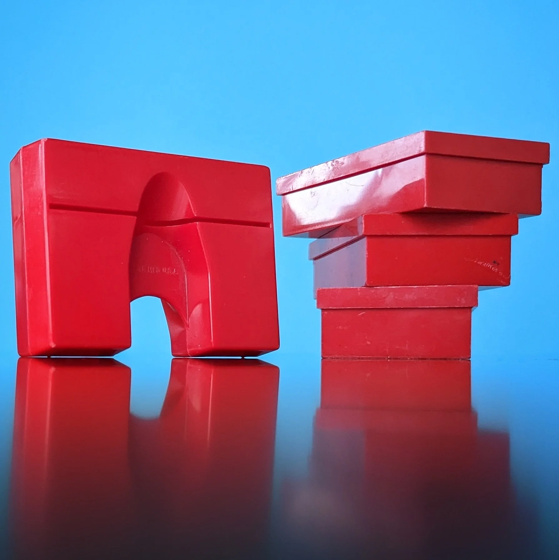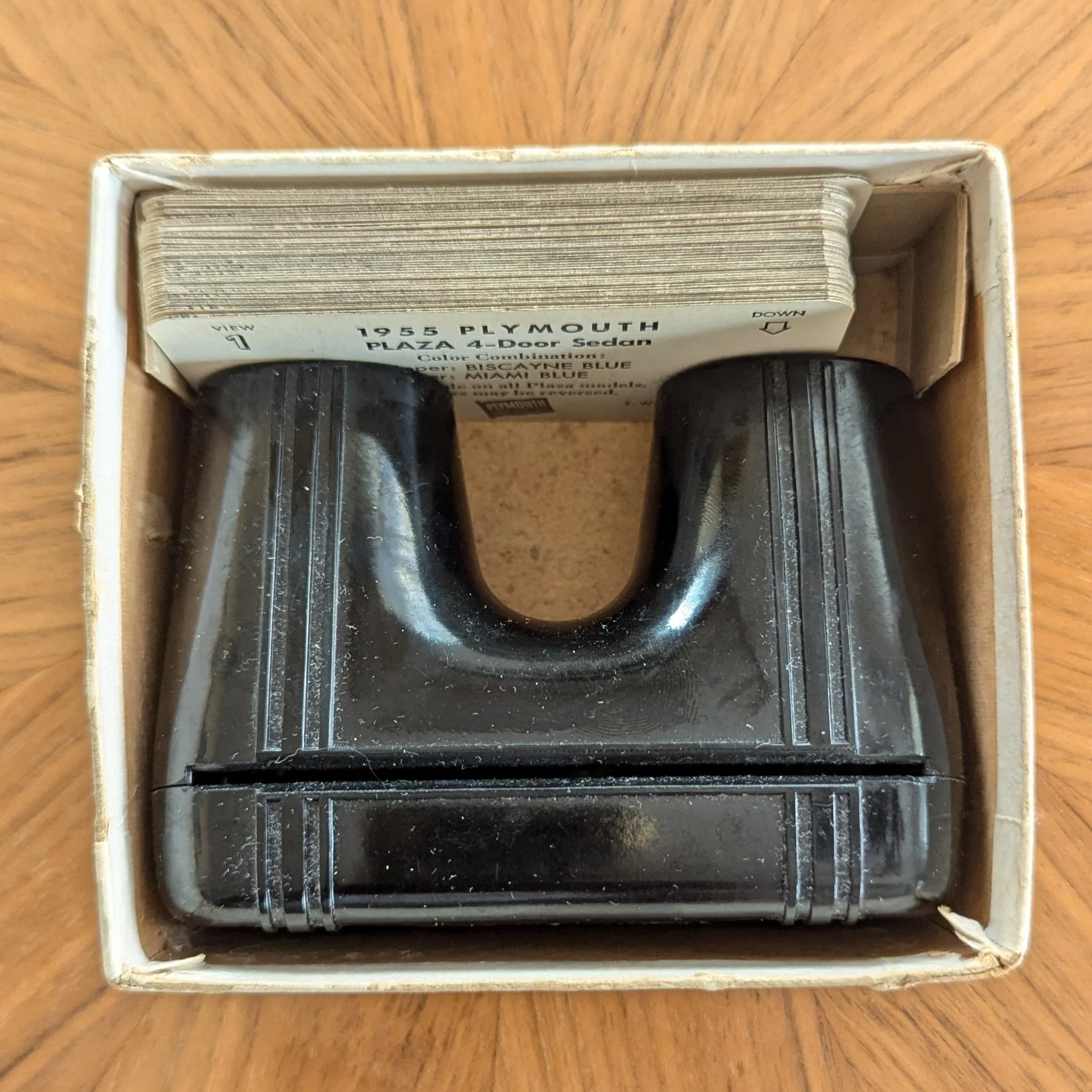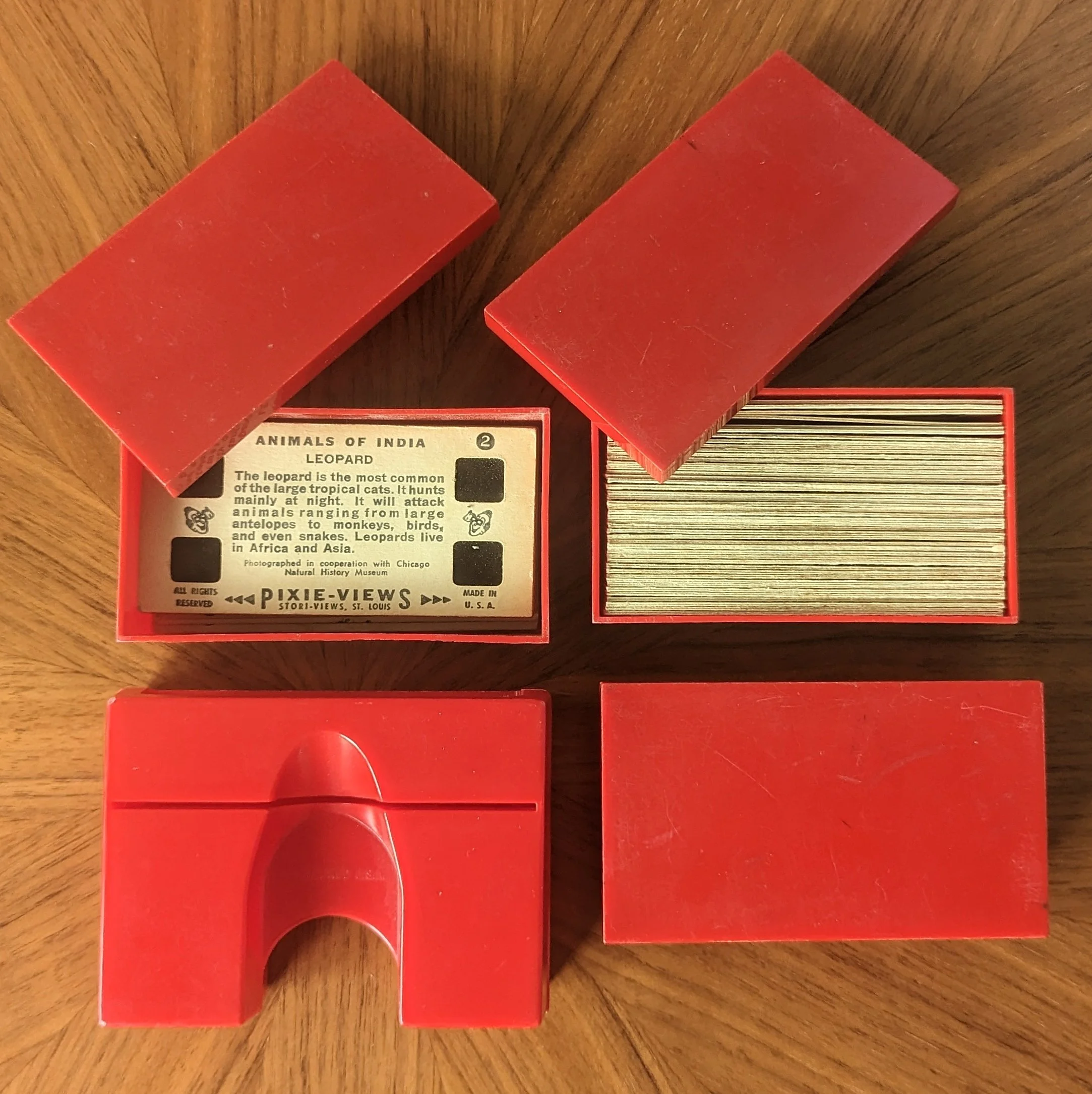 This version is the smallest of all the plastic Church-Craft viewers and we have a red and turquoise blue in our collection. There were even matching plastic storage cases for the views! The cases could accommodate both the single-view cards and the double-view cards (most of the earlier Church-craft Pixie-Views were double-view cards) , as shown in the photo below.