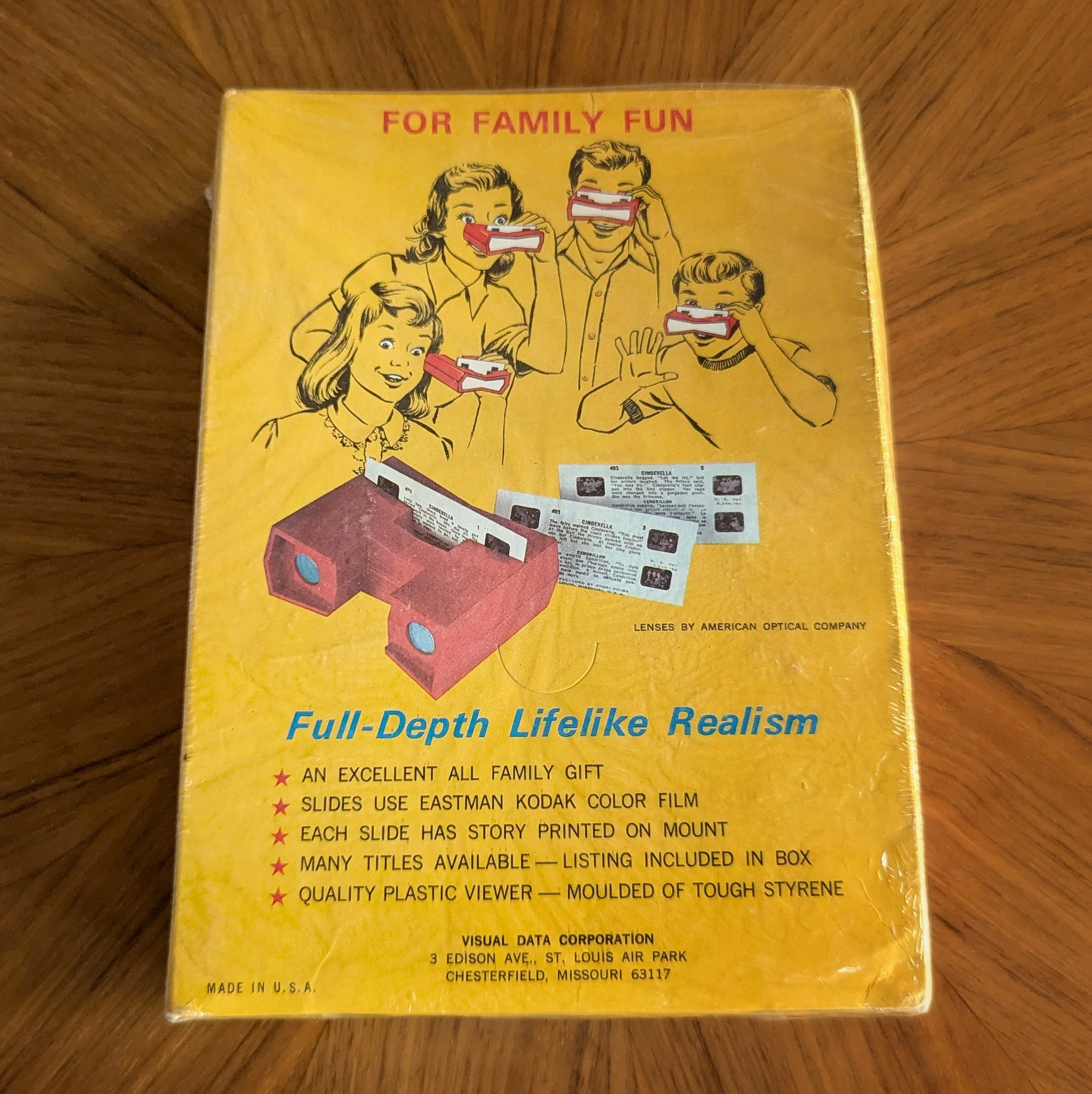 There’s no reference to Stori-Views at all on this look-through box except for printed at the very bottom of the slides pictured on the back. The box references Visual Data Corporation, without mentioning that it’s a division of Stori-Views. There’s also a reference to American Optical Company for making the lenses.