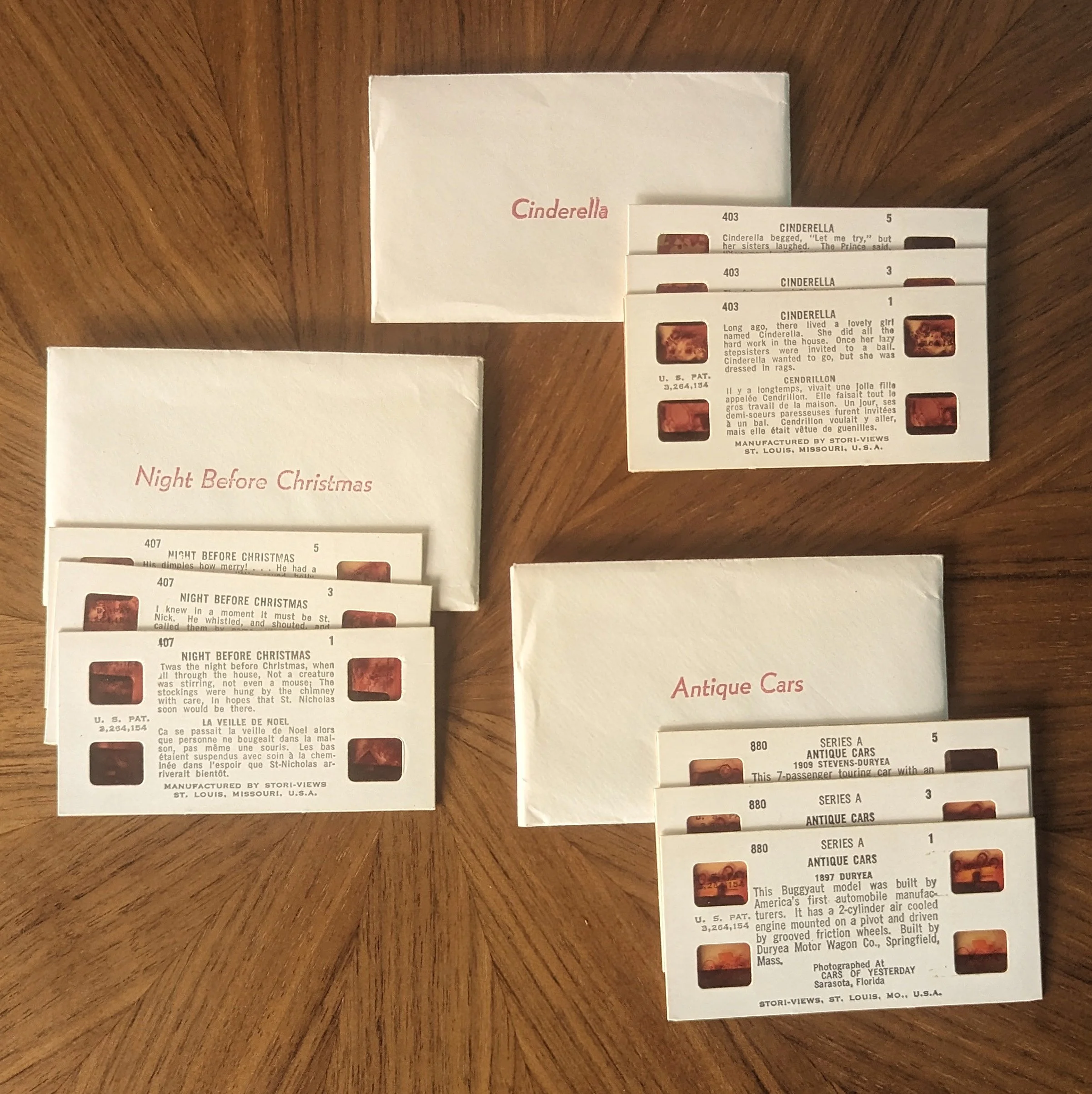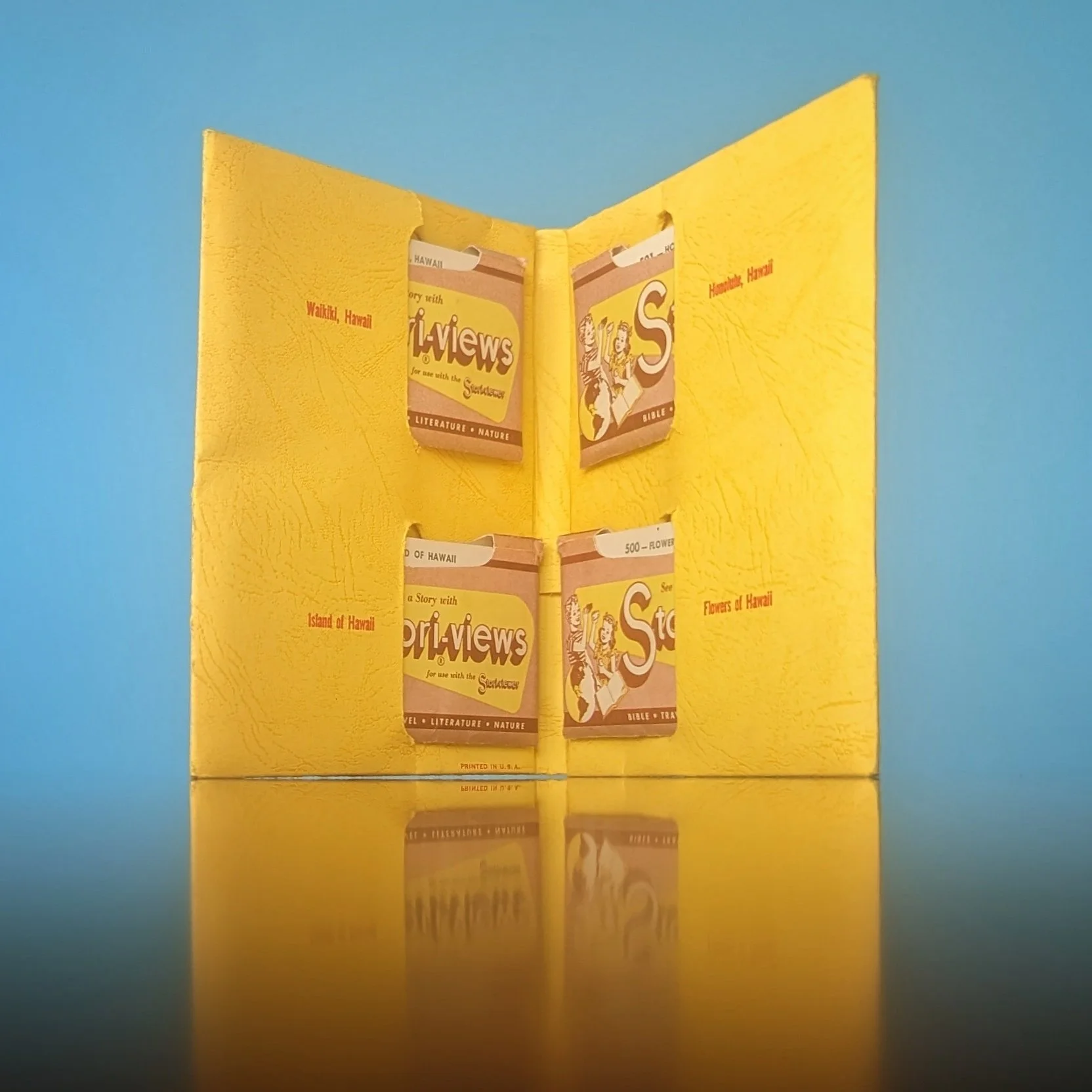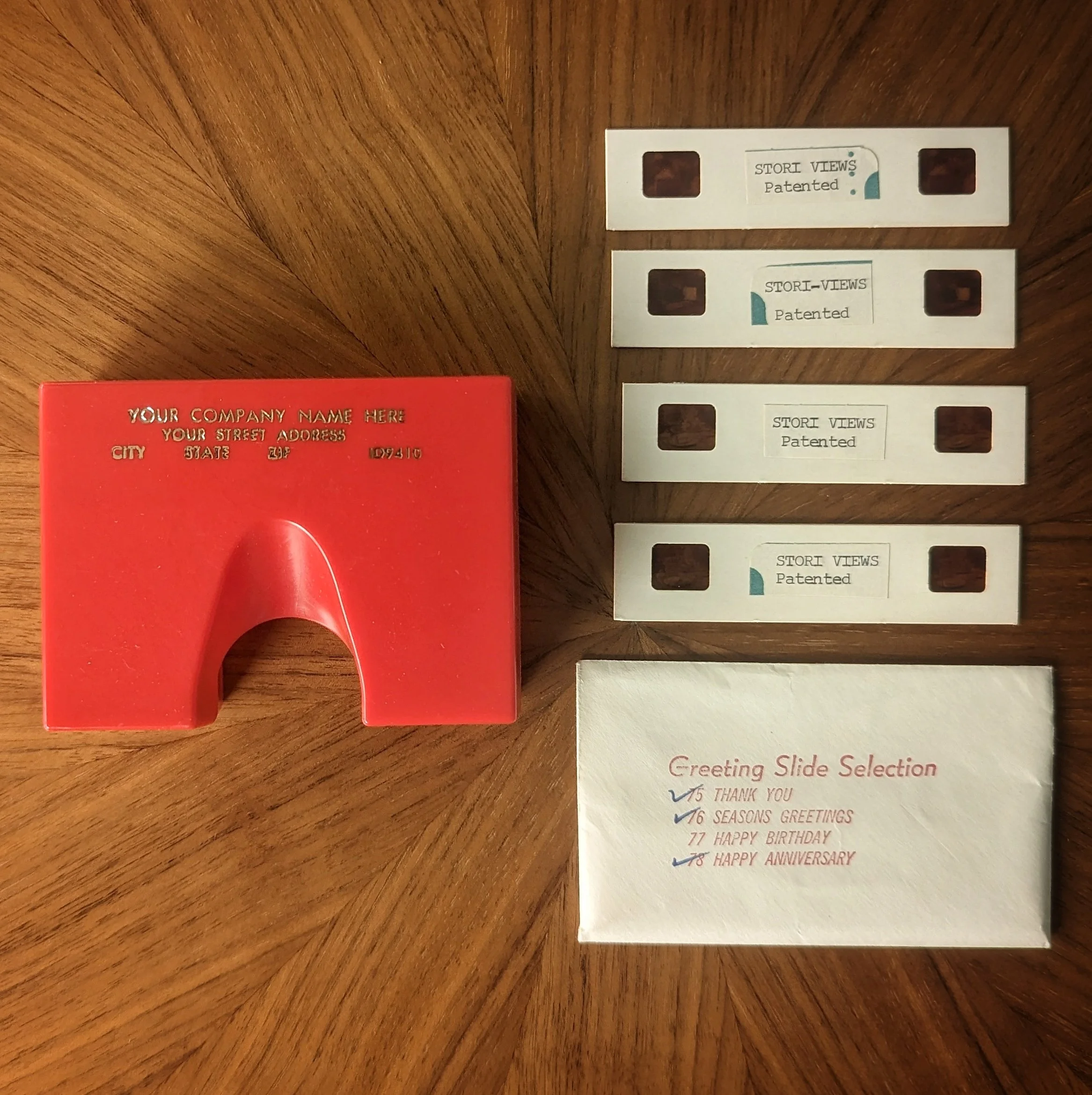 Here we see Stori-Views begin to branch out into offering branded viewers to companies to advertise their products in 3D. There’s a sample viewer with “Your Company Name Here” and a placeholder address printed on it. It came with sample stereoviews of assorted greeting arrangements. It also came with a few of the regular Stori-Views sets in envelopes.