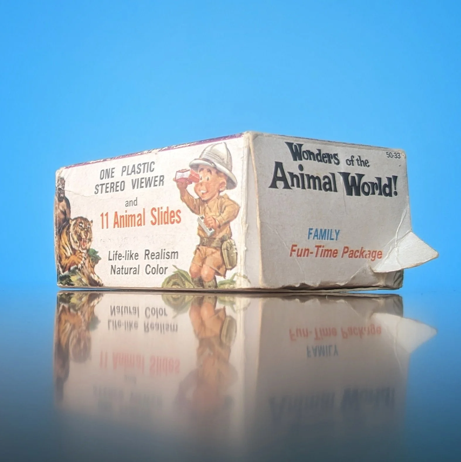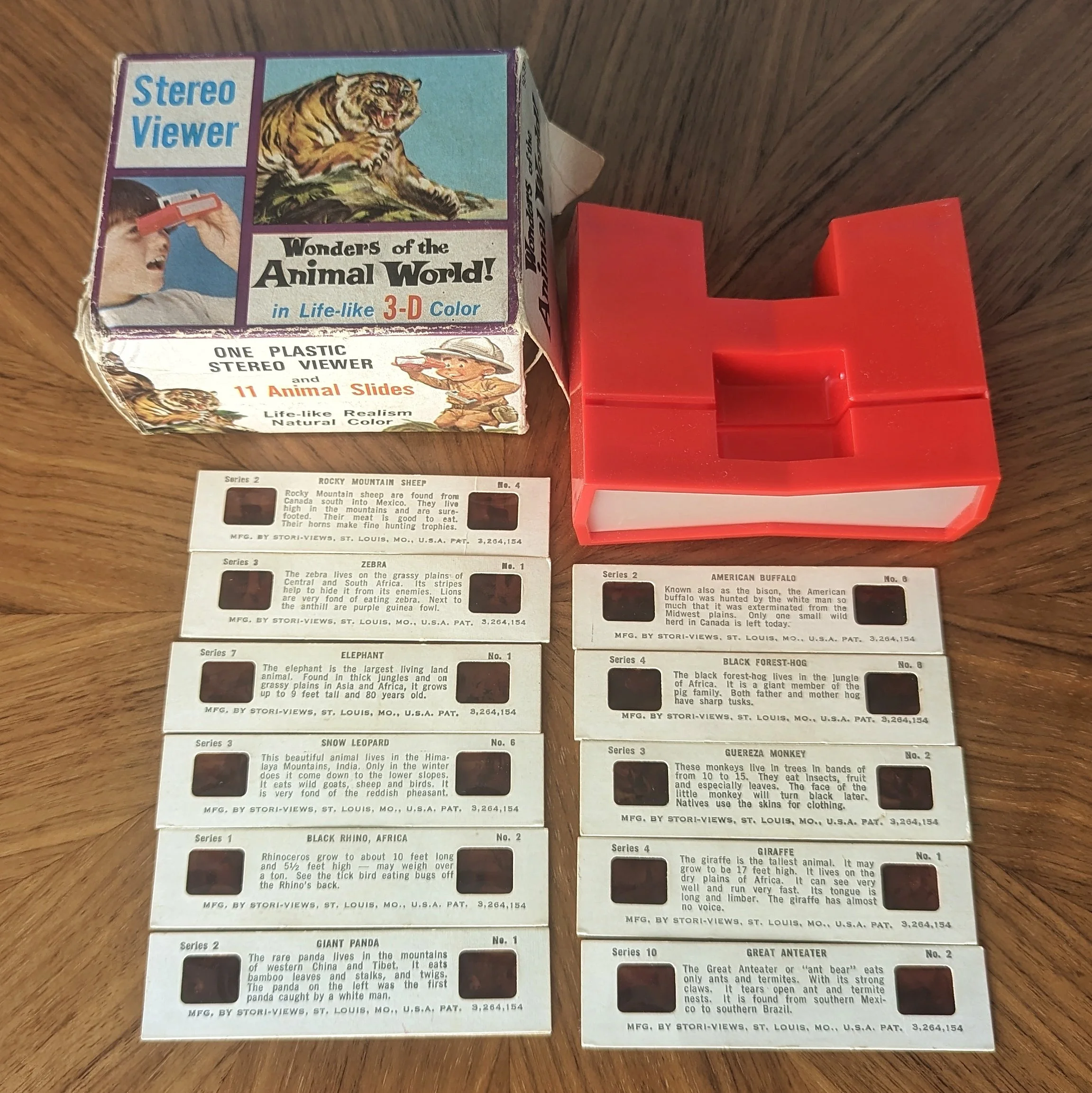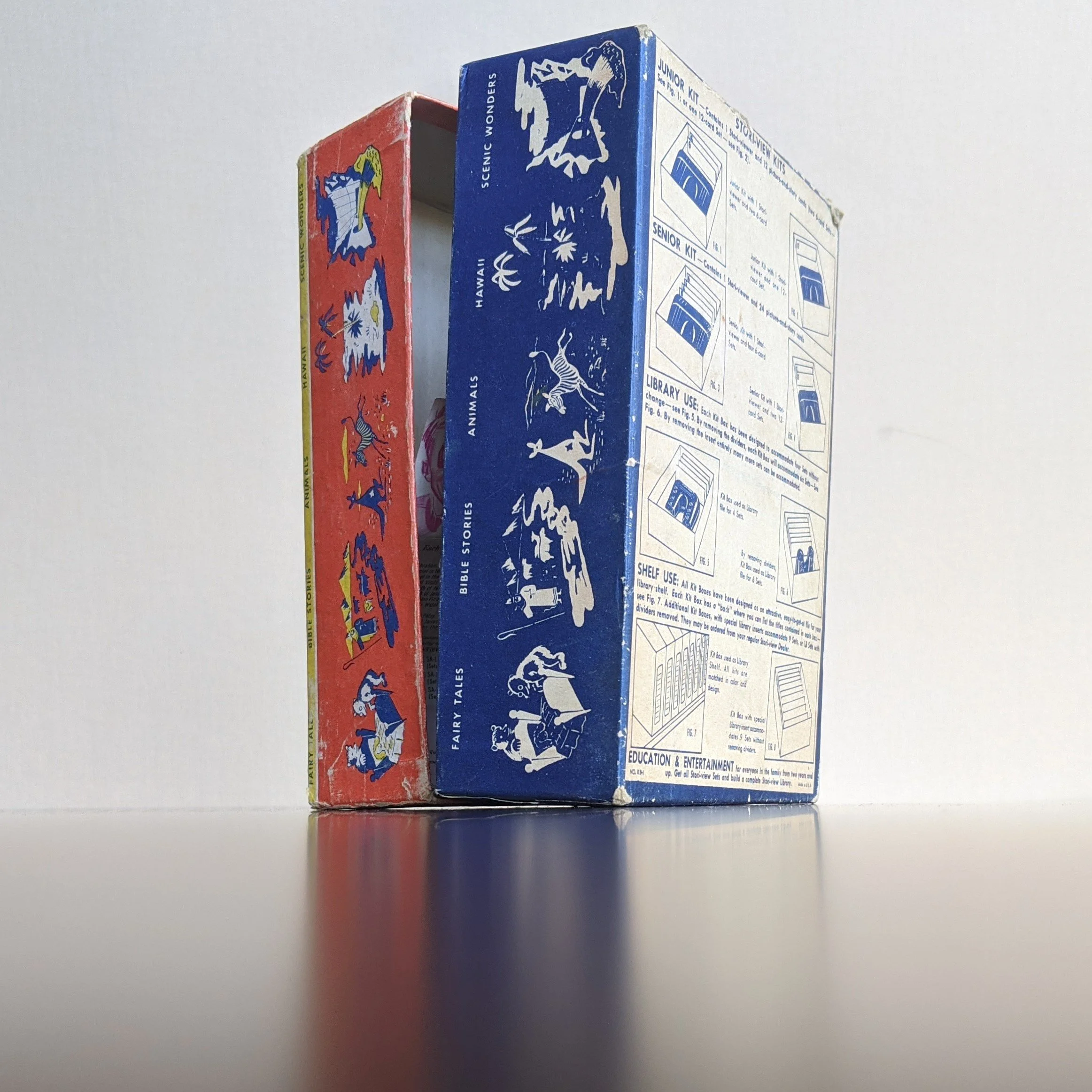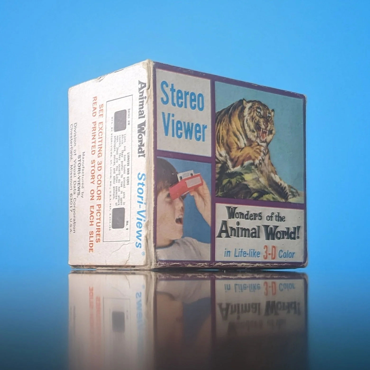 Here’s another example where there are 2 different viewers shown on the package. The boy on the front of the box is holding the small plastic Stori-Viewer (same graphic from the look-through Bible Stories packaging above) but the viewer on the back is the larger version that’s actually in the box. Another interesting note is the reference to Stori-Views being a division of Visual Data Corporation, similar to how Church-Craft was listed as a division of Visual Data Corporation on the Bible Stories look-through box above. Note the collaboration with the Chicago Natural History Museum printed at the bottom of the steroviews.