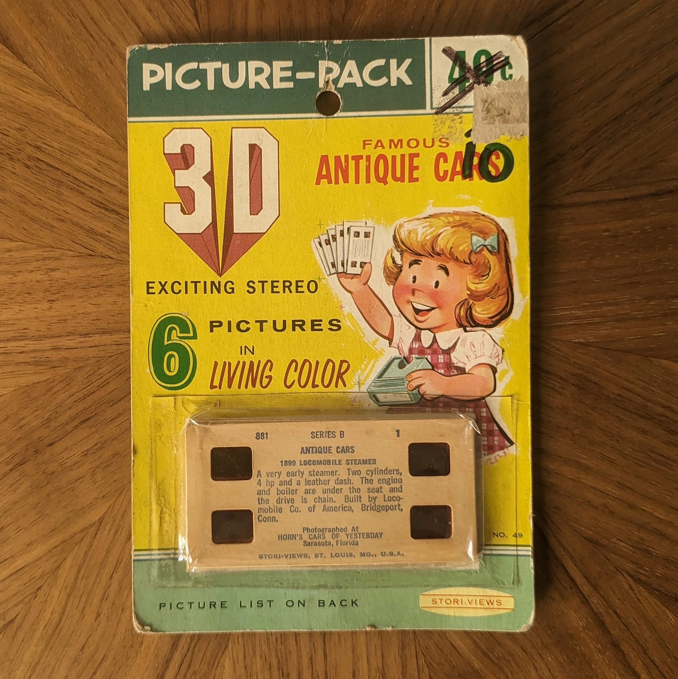 The first set below shows famous antique cars photographed at Horn’s Cars of Yesterday in Sarasota, Florida. The girl on the front of the package is actually holding the larger Pixie-Viewer while the back of the package depicts the smaller, plastic Stori-Viewer. (It wasn’t uncommon for Stori-Views packaging to re-use graphics from earlier packaging.) However, in the packaged set with the fun Bozo graphics, the boy is pictured with the correct viewer.