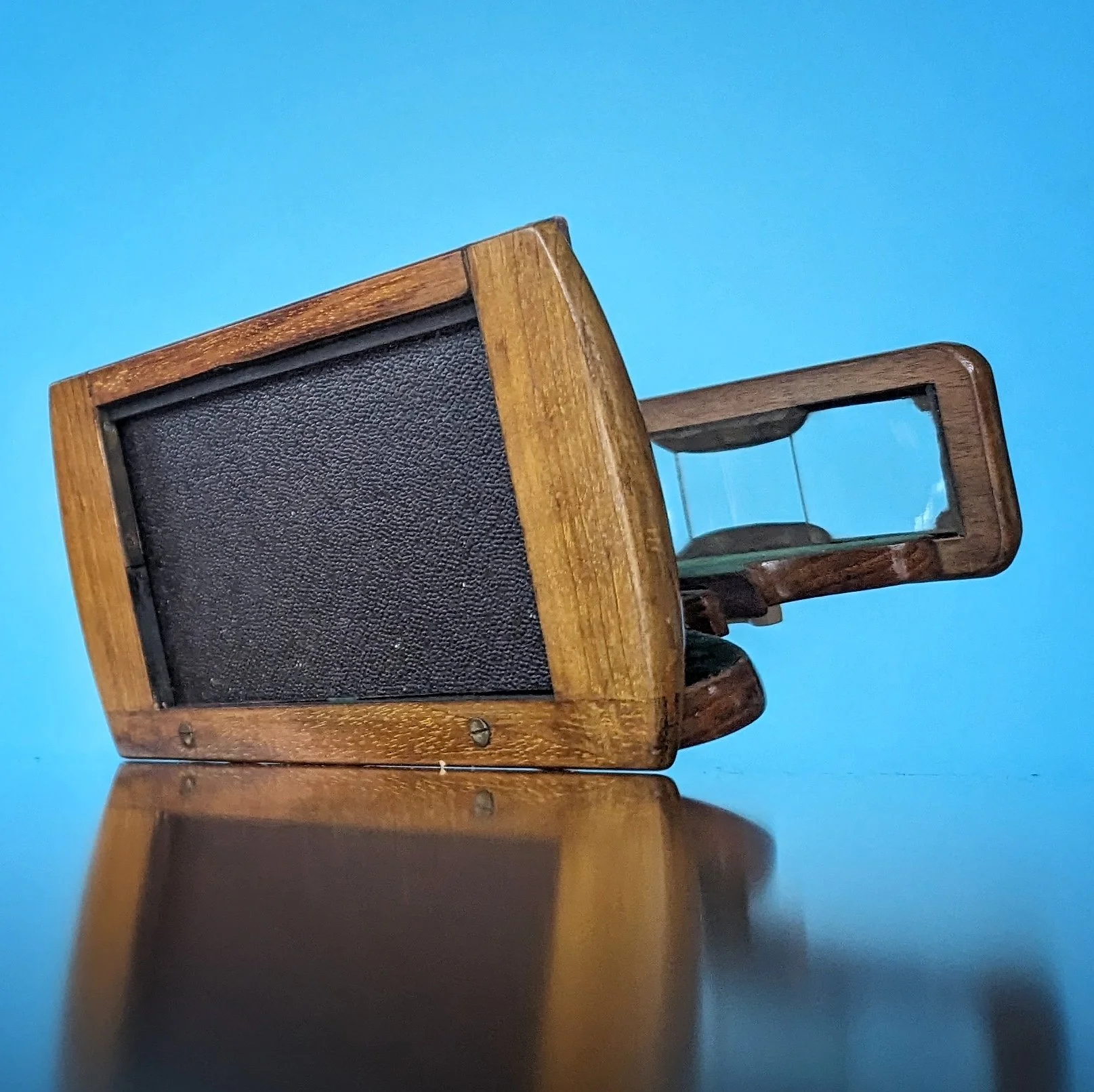 Patented by Henry Swan of London in 1858, this stereoscope could be used with paper, glass, and books. Focus is achieved by sliding the two parts back and forth on the two metal prongs. Supposedly the viewer is meant to be held by the knob on the bottom (marked "Swan's Patent - Clairvoyant") with one's thumb inserted into the hole to move the lens board. However, we couldn't move it like that very easily. The back panel swings up and there's ribbed glass between the left and right lenses rather than a central divider piece. The accompanying locking cases are marked "The Stereoscopic Treasury" on top and have an inside divider insert for holding the cards. The viewer is then stored upside down inside the case, on top of the cards.