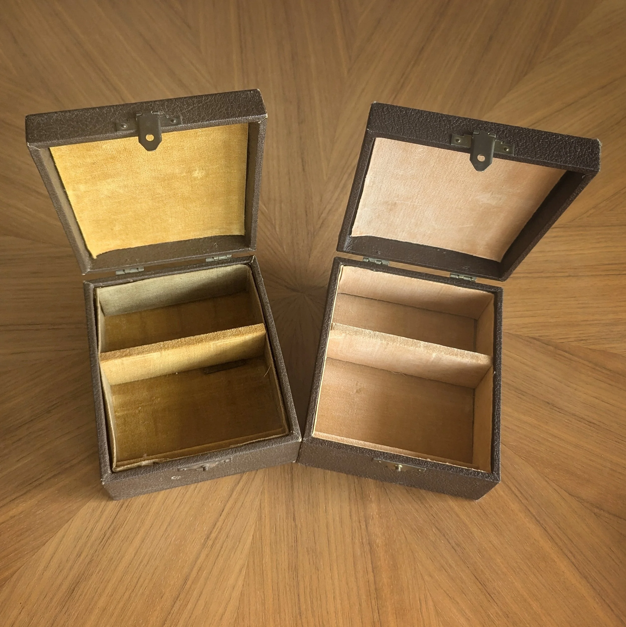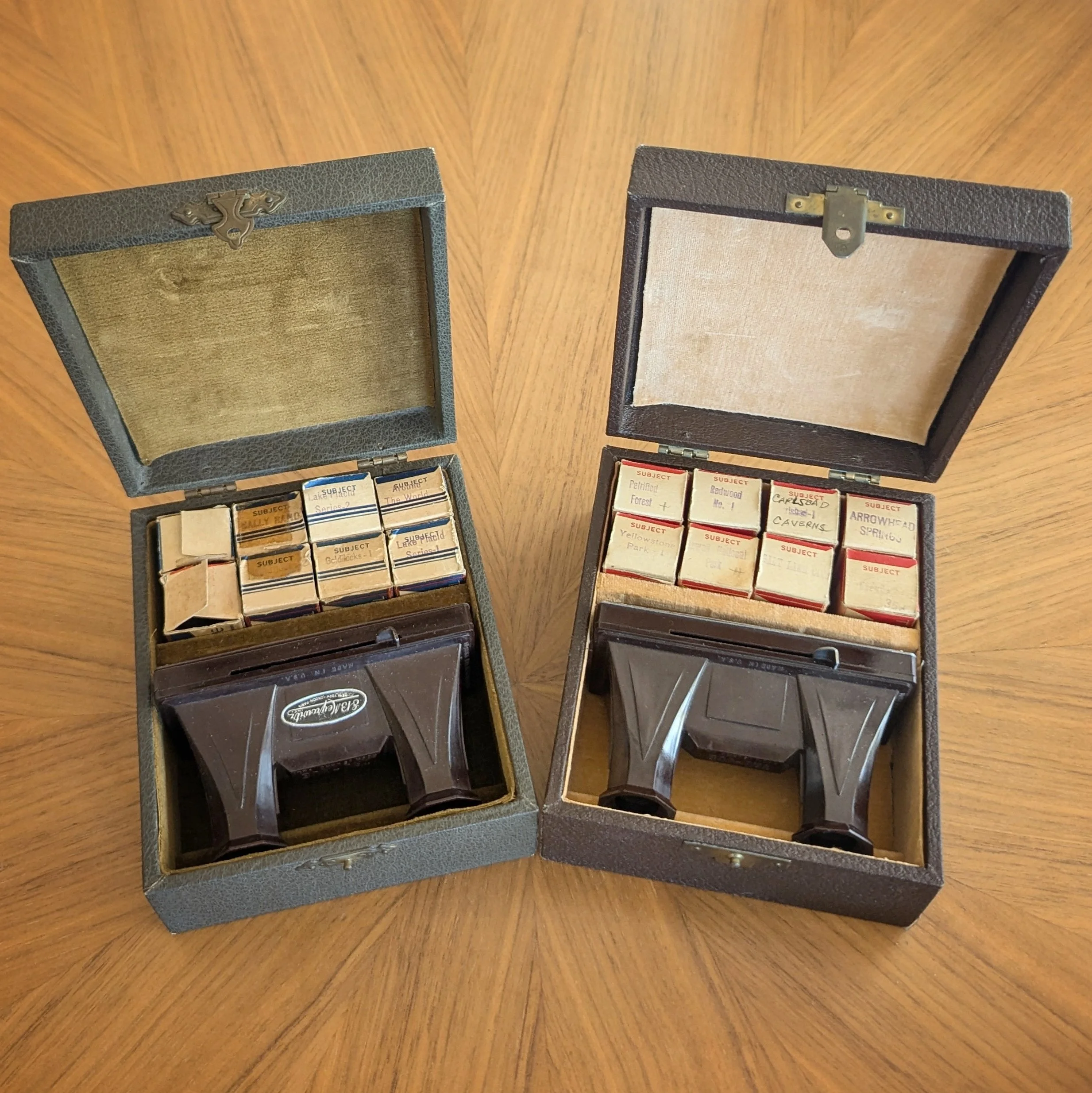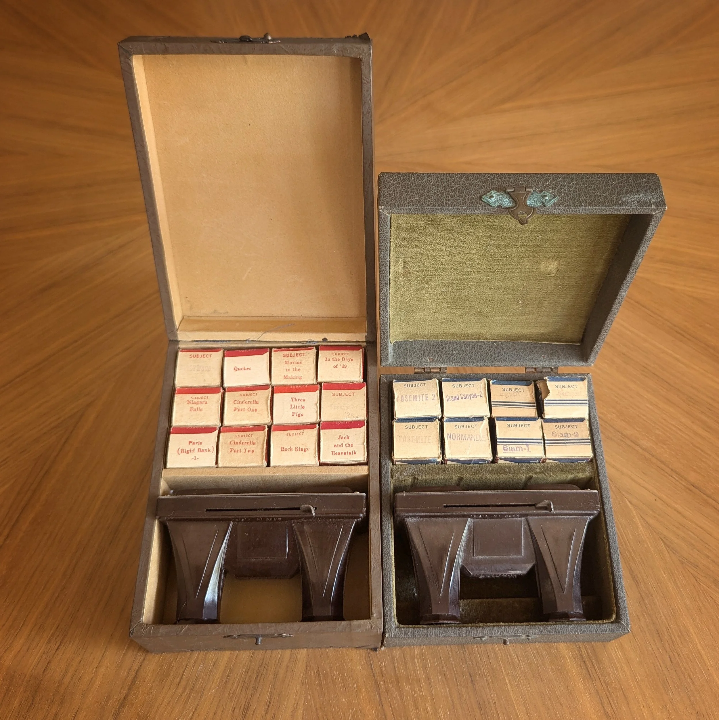 While both are designed to accommodate one Art Deco-style viewer and 6 film boxes, they are slightly different. As the close-up pictures below show, one of them opens evenly in half — the bottom half is the same size as the top half — while the other opens more towards the top so that the top half is smaller than the bottom half. While both wood cases are the same size, the custom cardboard inserts are slightly different sizes to account for the different bottom-half sizes.