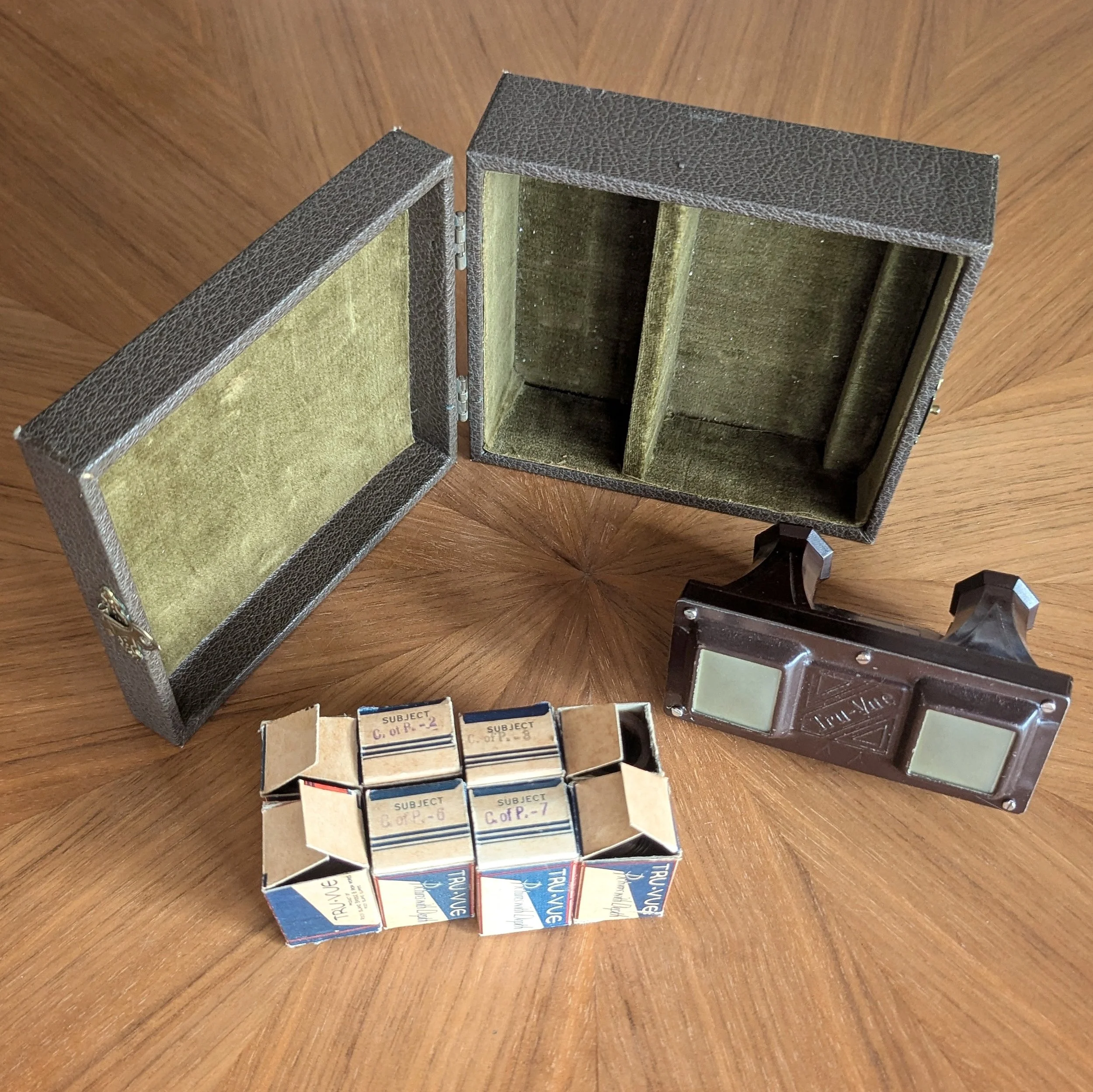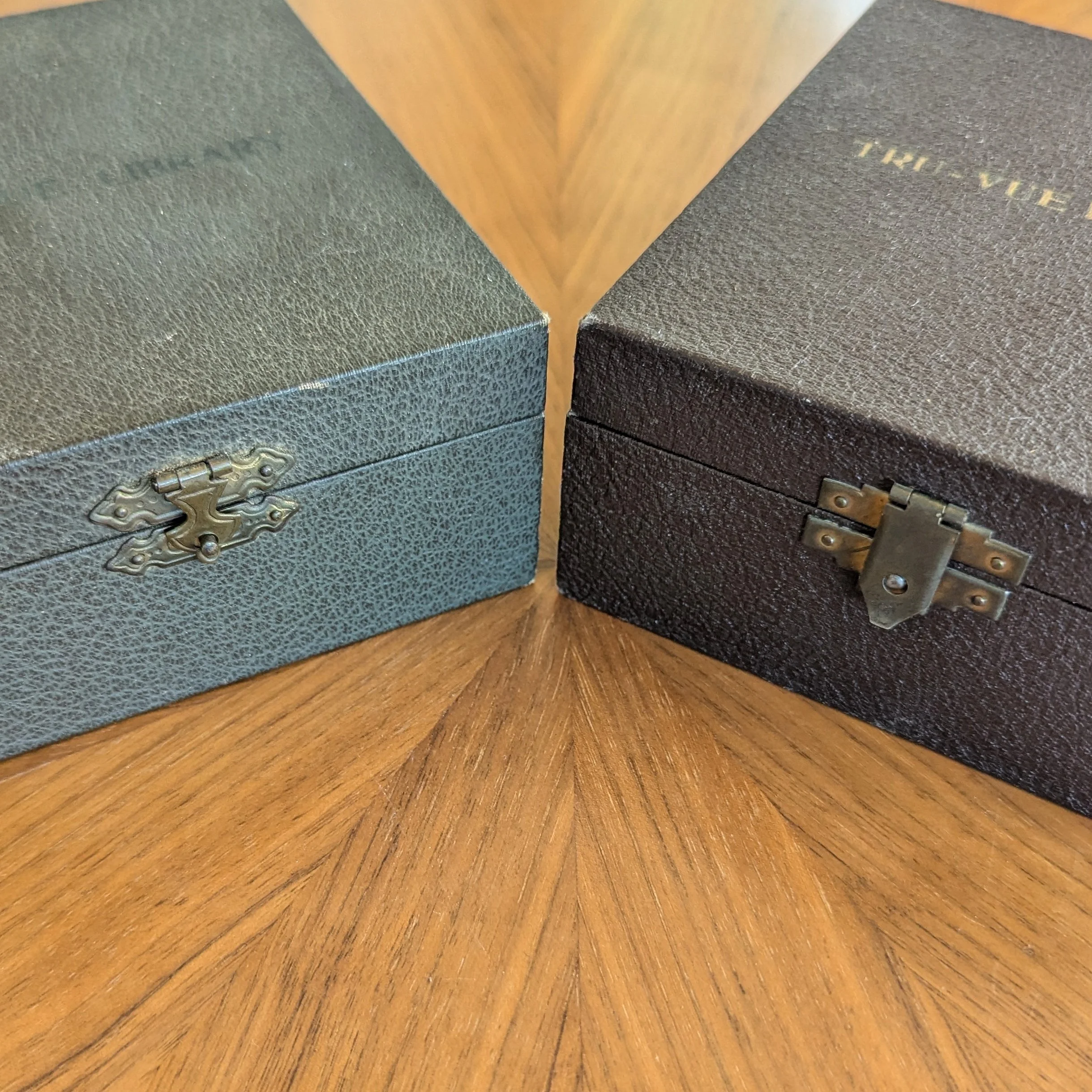 The leatherette Tru-Vue case has a textured, leather-like covering and introduced metal hinges and a snap latch instead of the swing latch used by the earlier, paper-covered case. It’s also smaller than the paper-covered case above, accommodating a viewer and only 8 film boxes, instead of 12.