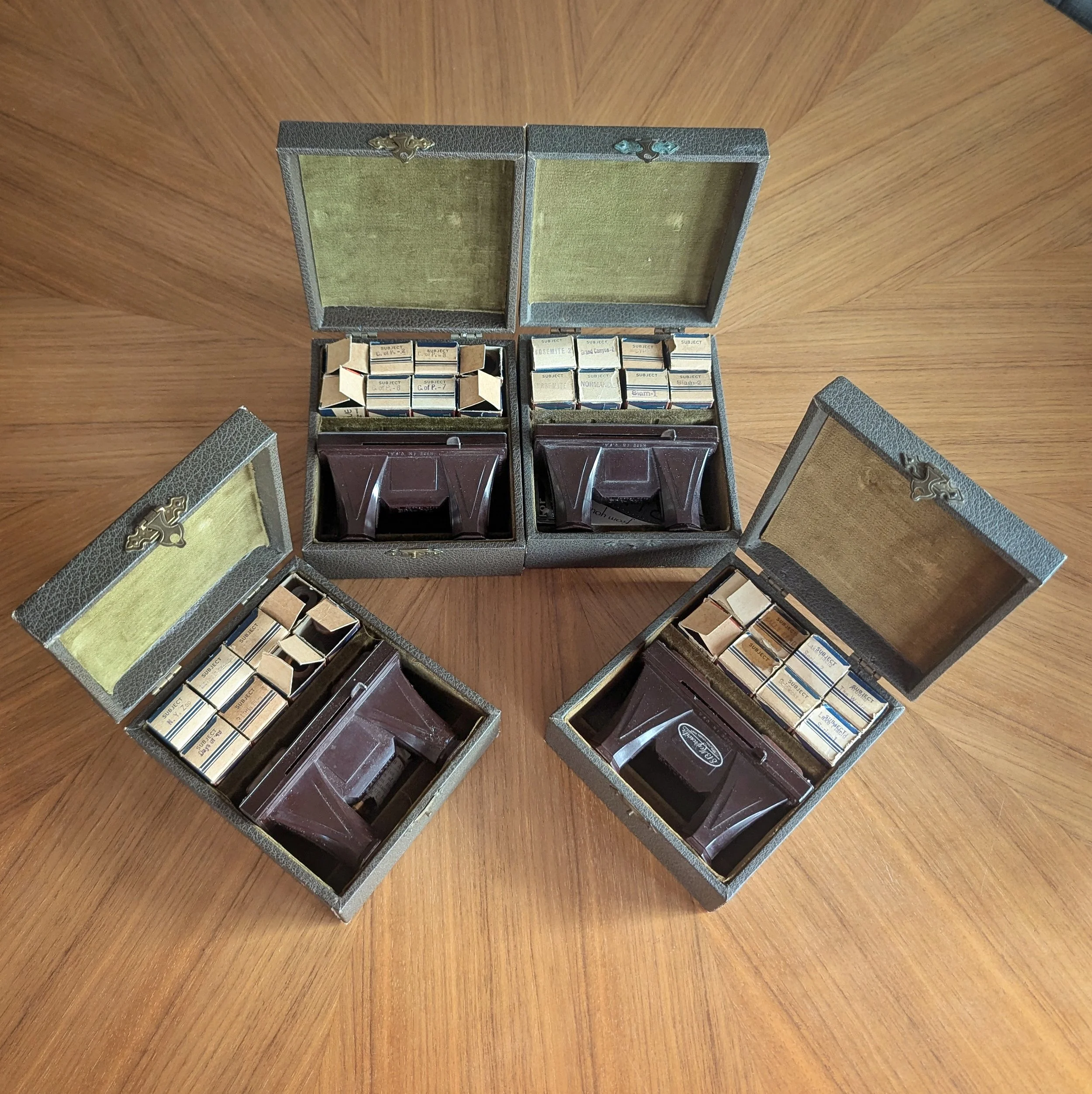 This inlaid wood case is non-standard because it opens on the long side of the case. This is the larger of this style in our collection, accommodating one Art Deco-style viewer and 12 film boxes in a custom cardboard insert.