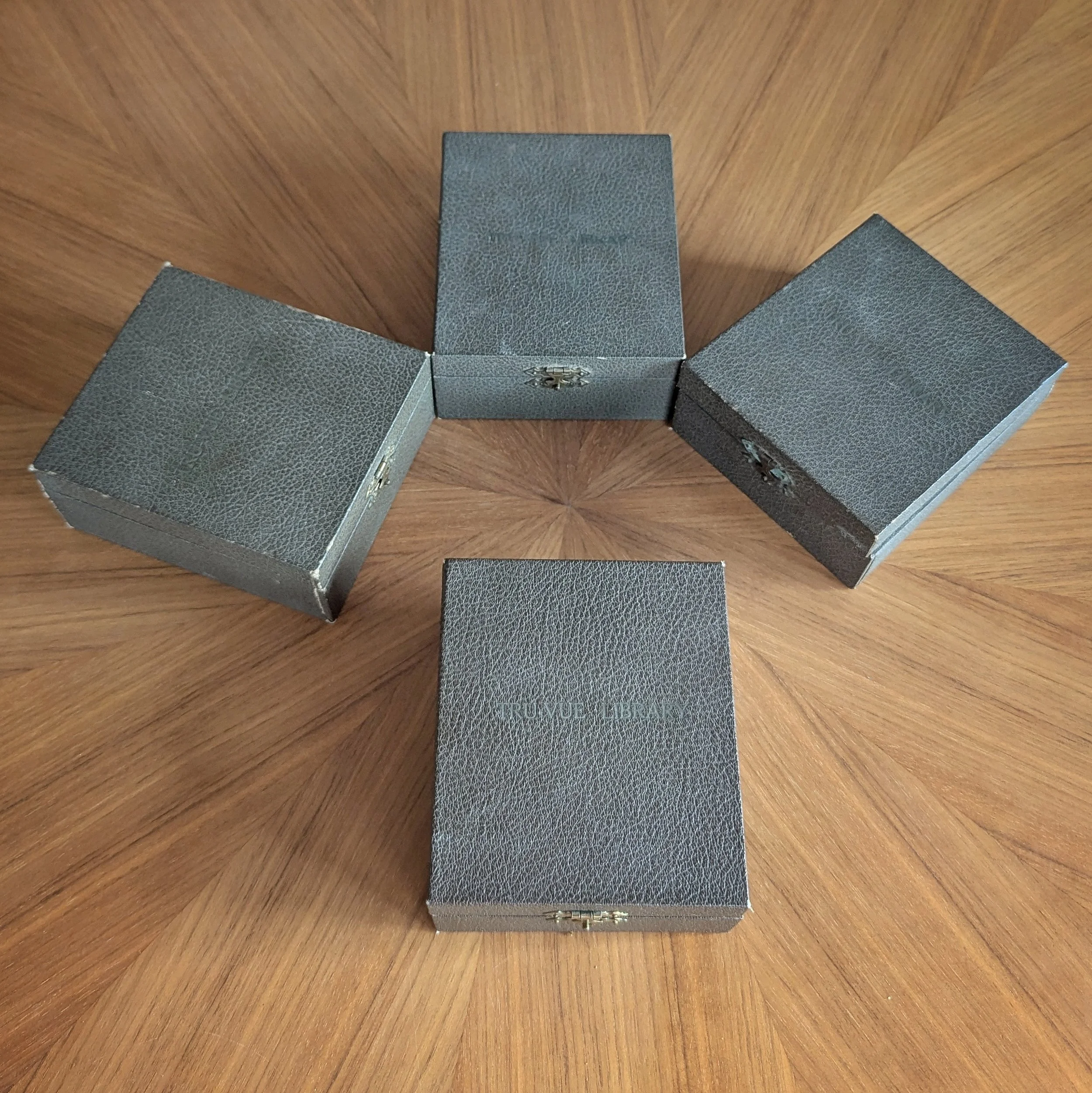 The smallest one, shown here, has a fancier latch, and we’ve only seen it with green velvet interior. Additionally, the exterior of all the ones in our collection seem to have a green hue.